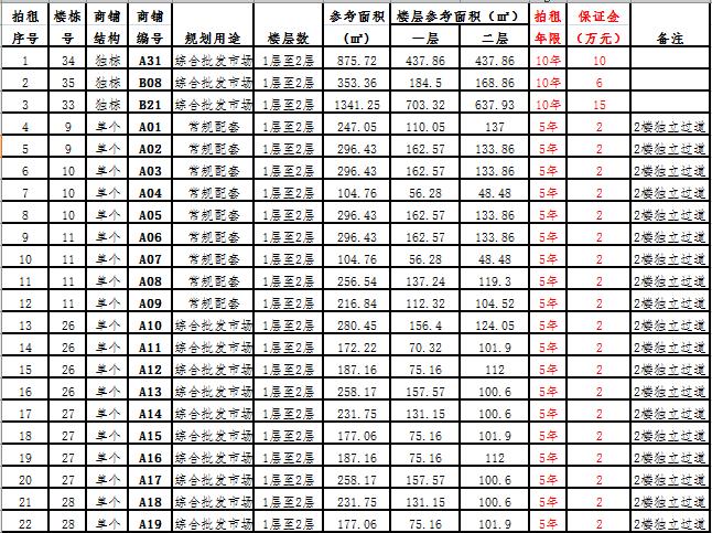 (一)拍租一層至二層獨棟商鋪3棟,使用期10年,每棟商鋪預(yù)交競租保證金6萬元至15萬元不等, 詳見商鋪簡介(欲競租多棟商鋪,保證金類推);