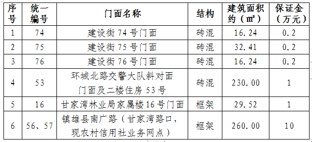 1、拍租6個(gè)門面3年期使用權(quán),詳見下表: