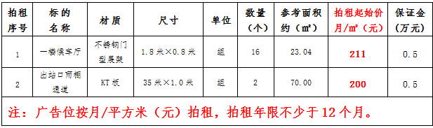 (四)拍租鎮(zhèn)雄縣開(kāi)元商業(yè)物業(yè)服務(wù)有限公司以勒高鐵站站前廣場(chǎng)各類廣告位使用權(quán),詳見(jiàn)下表: